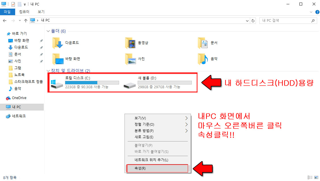 저장공간이 보이는 화면에서 오른쪽 마우스 클릭 → 속성